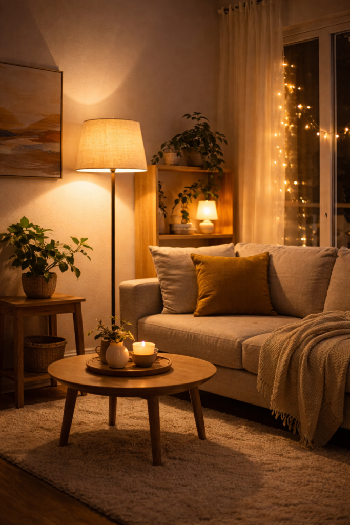 Accent Light: String lights, a small table lamp on a shelf, or LED strips behind a TV or under a bed to add a cozy glow.