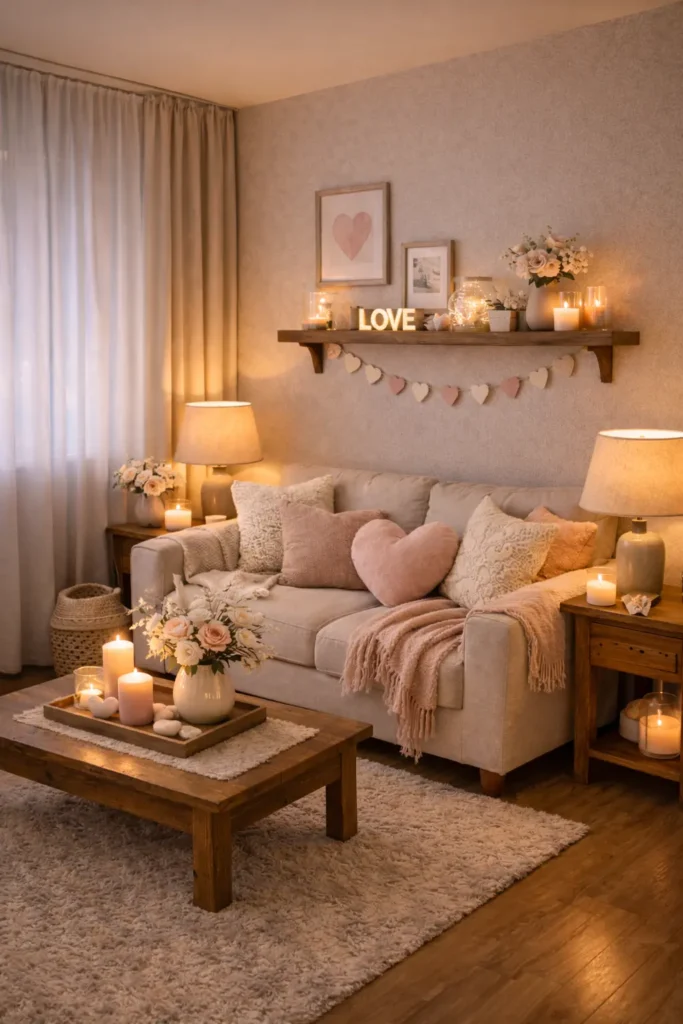 If you want a hint of Valentine’s color, add it in small touches — flowers, pillows, or candles — while letting your everyday decor stay visible.